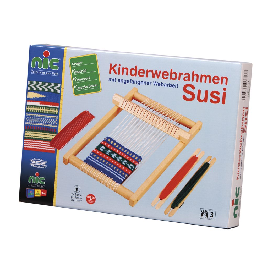 This high-quality and traditionally handmade children's loom Susi made of beech wood is very stable and designed to be passed on to the next generation. In addition to the woven pattern, the scope of delivery includes two weaving boats, a folding reversible comb and a stop comb. The professional turning comb pulls the warp threads apart so that the weaving vessels can be moved more easily between them.