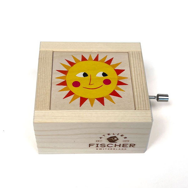 A Swiss-made music box from Atelier Fischer's Natura series, featuring a cheerful sun. Made of spruce and birch plywood. Various melodies.