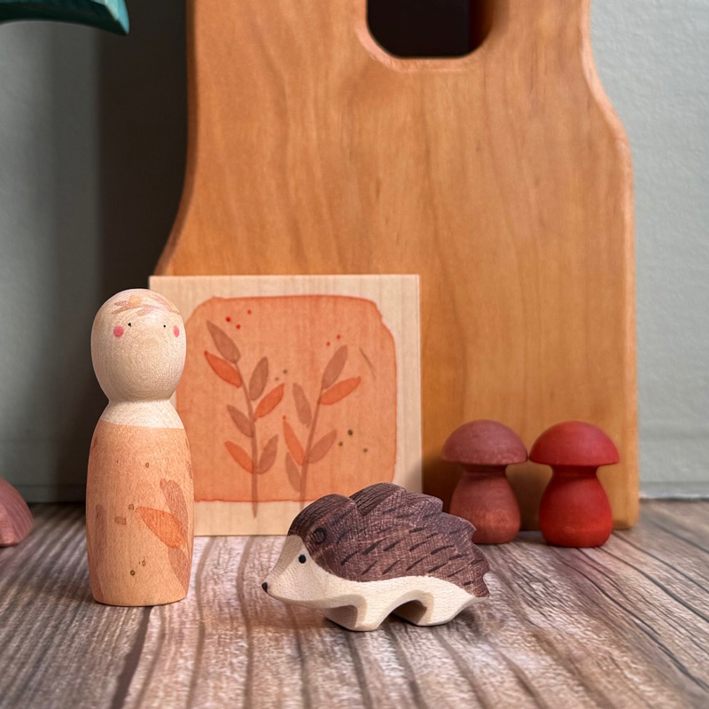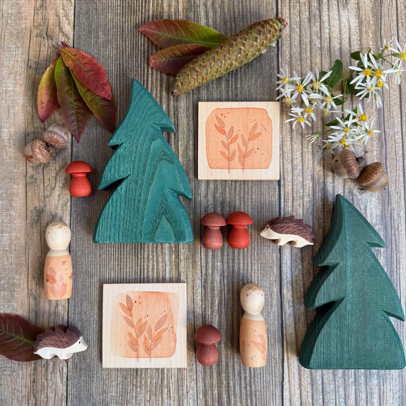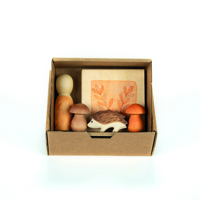 The box contains 5 Autumn themed pieces: 2 mushroom mandalas. 1 Nin. 1 Press (w/papers and rubber band) 1 miniature hedgehog