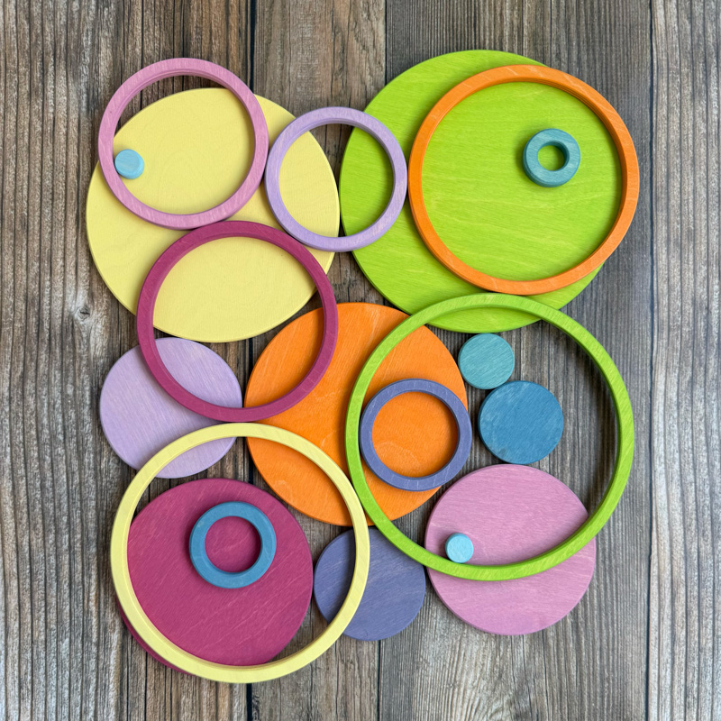 Ten circles and ten rings in different sizes and colors invite you to have lots of fun building and playing. With a love of experimentation and a sure instinct, balance games, airy buildings and multifunctional platforms can be created.