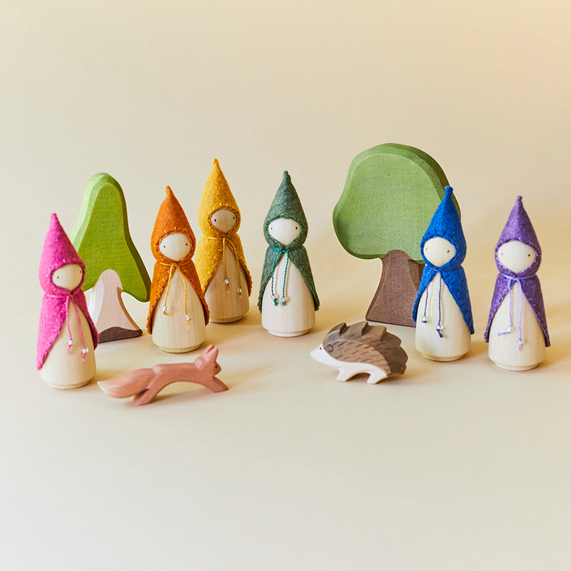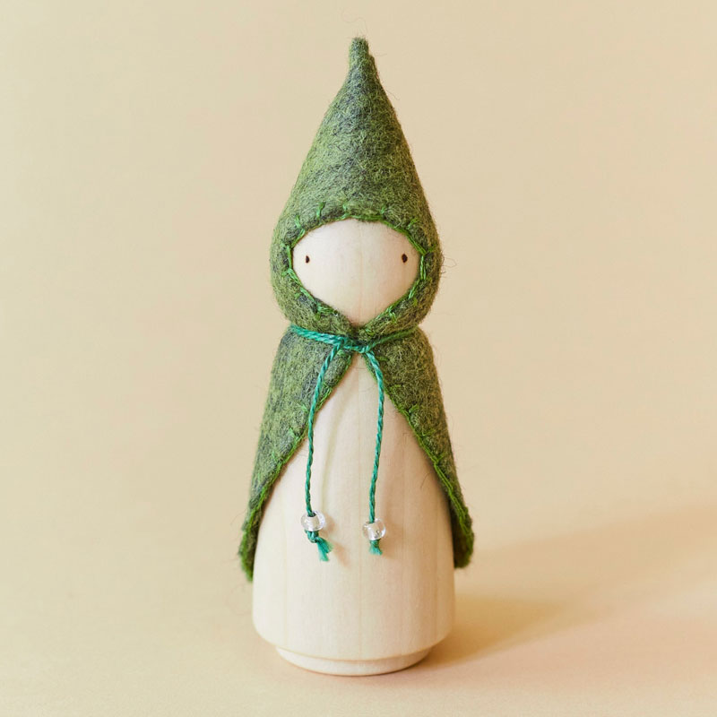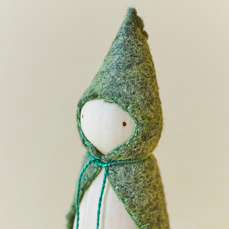 Meet our enchanting woodland gnomes, delightful companions for small world play that appeal to the young and the young at heart! Crafted with care, this charming gnome features a beautifully hand-stitched greenwool coat with a cotton tie and glass beads, adding a touch of warmth and whimsy to any imaginative adventure.