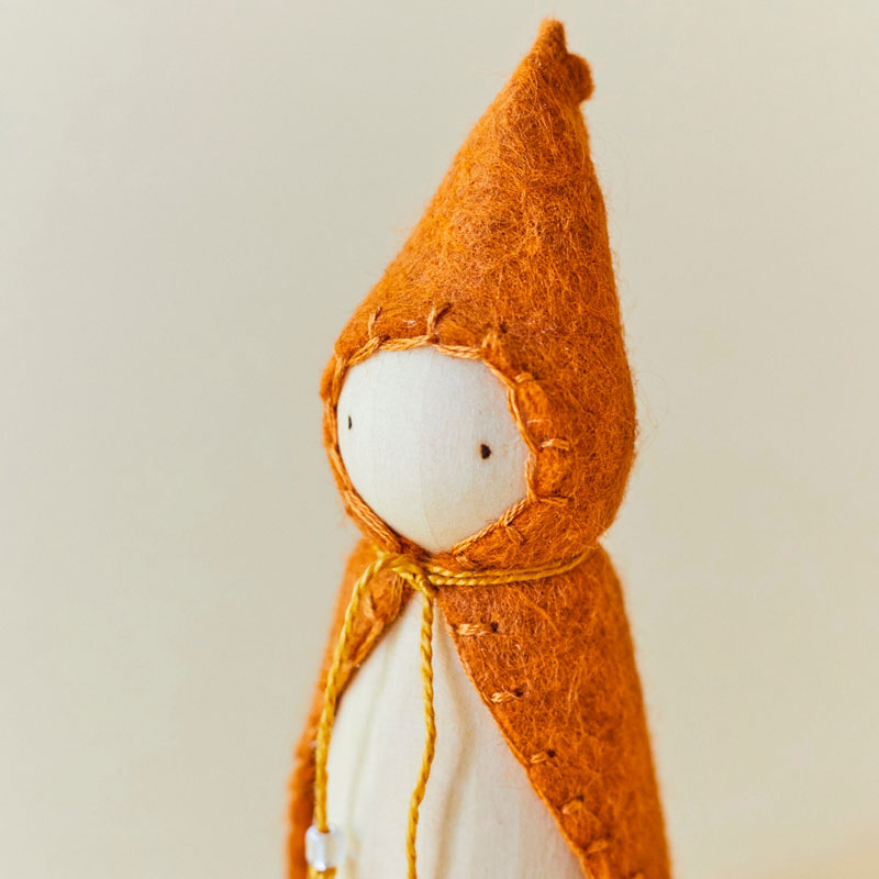 Meet our enchanting woodland gnomes, delightful companions for small world play that appeal to the young and the young at heart! Crafted with care, this charming gnome features a beautifully hand-stitched yellowwool coat with a cotton tie and glass beads, adding a touch of warmth and whimsy to any imaginative adventure.