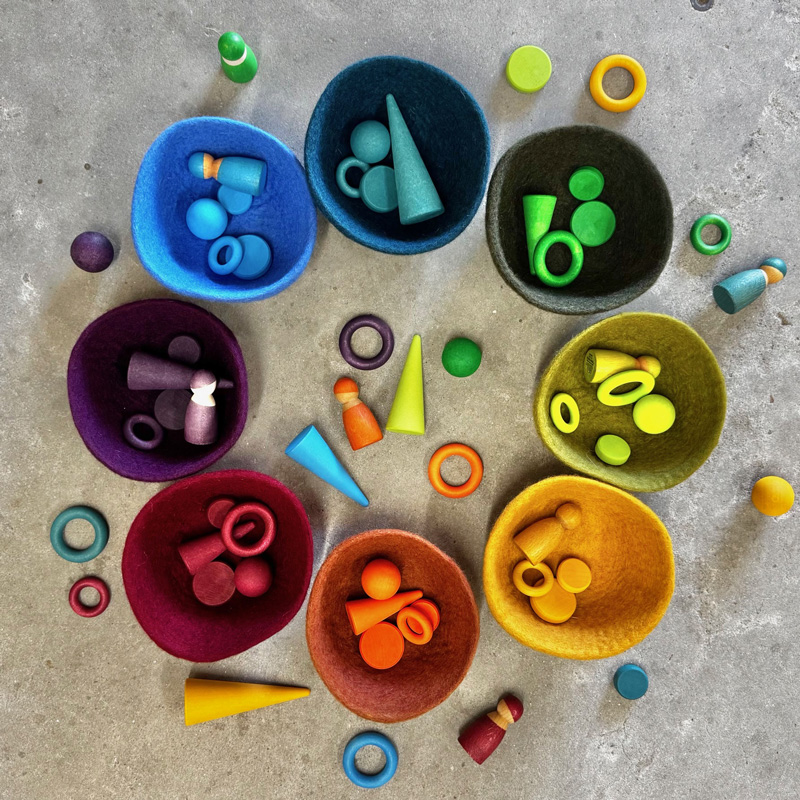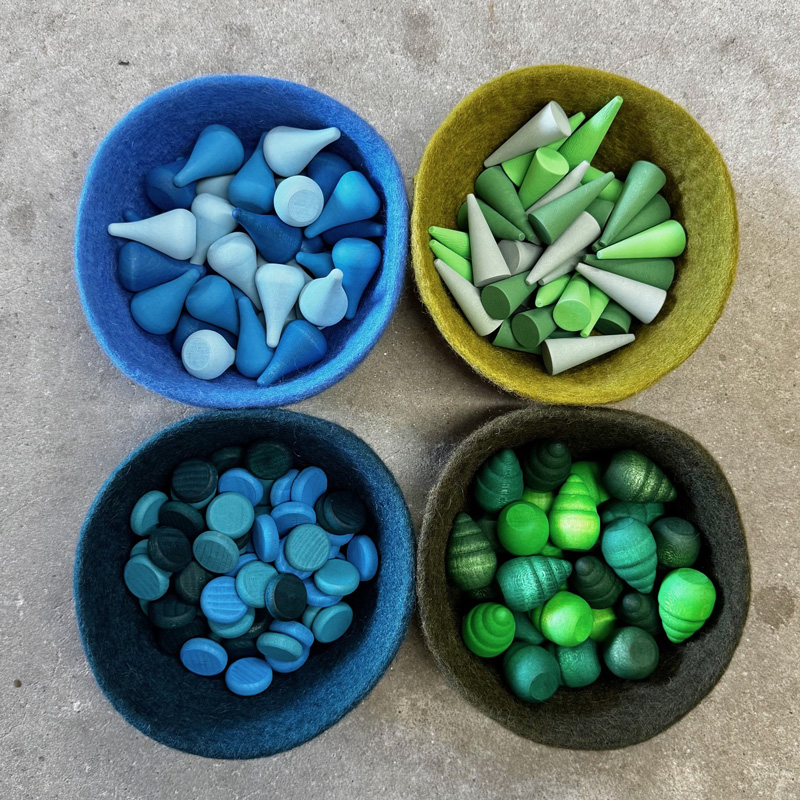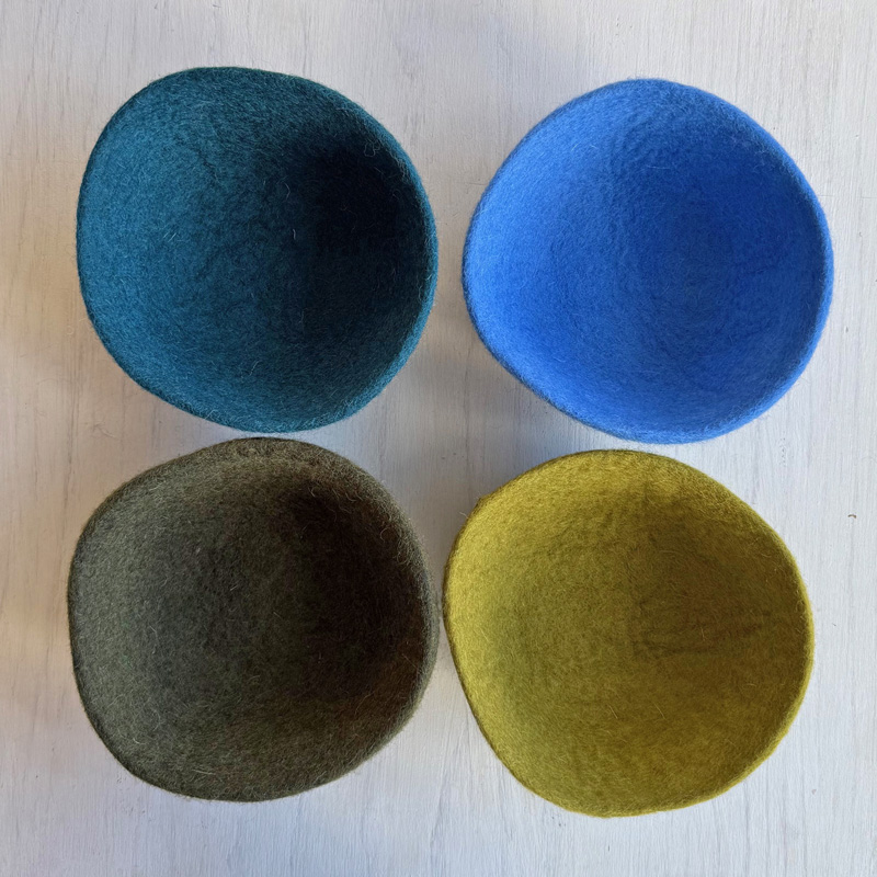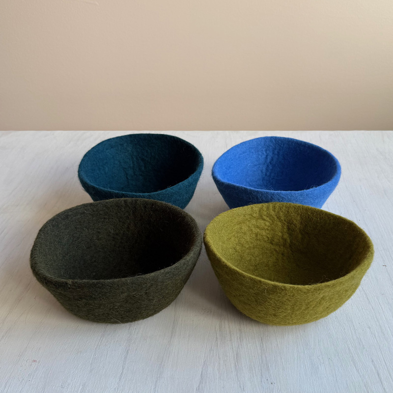 A set of 4 felted bowls in cool colors, perfect for sorting and storage. Fair trade crafted of natural wool in Nepal.