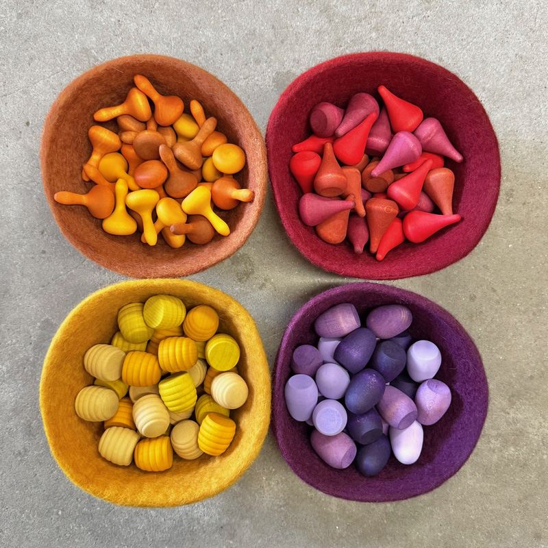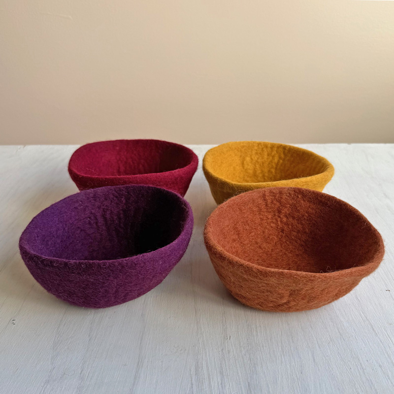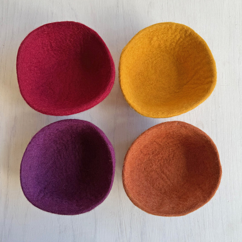 A set of 4 felted bowls in warm colors, perfect for sorting and storage. Fair trade crafted of natural wool in Nepal.