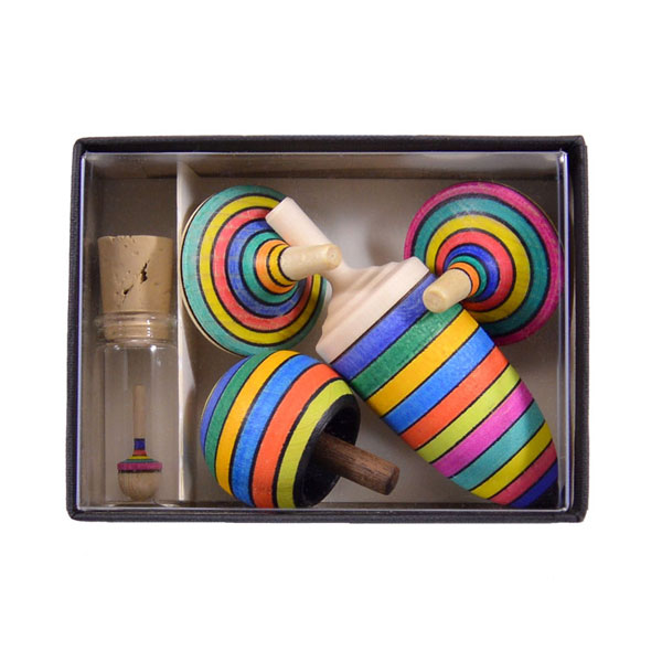 A set of five fun tops ranging from beginner to advanced skill level. Includes two Rallye, one Turnover, one Thunderbolt, and one Mini Liliput in a cork-stoppered glass bottle.