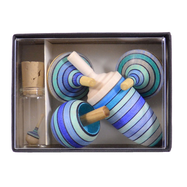 A set of five fun tops ranging from beginner to advanced skill level. Includes two Rallye, one Turnover, one Thunderbolt, and one Mini Liliput in a cork-stoppered glass bottle.