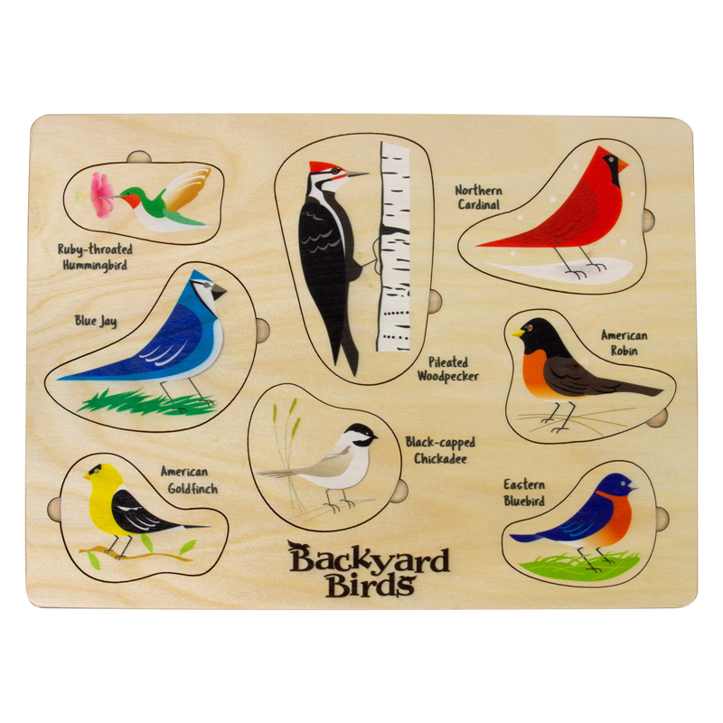 This brightly colored 8-piece puzzle measures 11 X 15 in. and is finished with a non-toxic finish. Eight beautifully illustrated birds are featured in this puzzle. Lift & Learn - under each bird, engraved on the puzzle, is an interesting fact about that bird. The printed images won't scrape or wear off. Crafted from 0.1" thick, high quality birch plywood with laser-cut pieces for precision fit. A perfect beginner puzzle for your favorite birder.