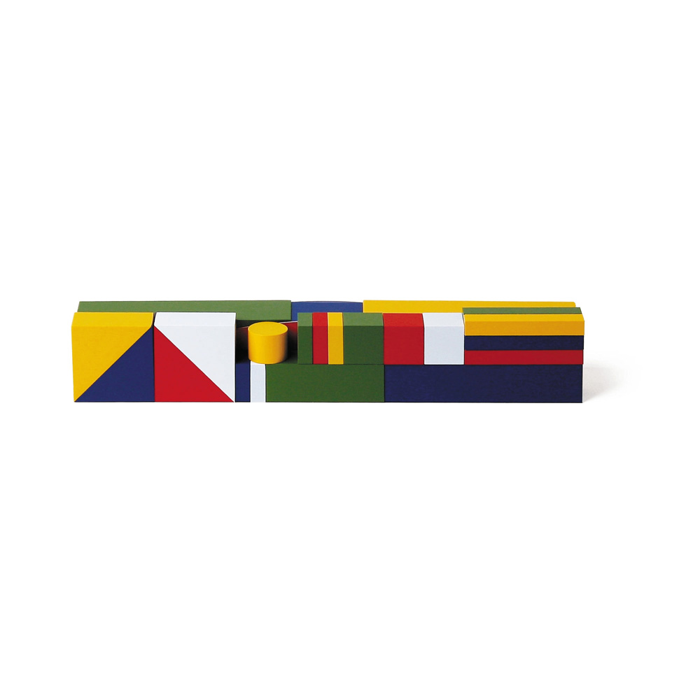 A true classic of toy design! Alma Siedhoff-Buscher designed this Bauhaus building game during her training at the legendary Bauhaus in 1923, as part of the children’s room in the model house “Am Horn” in Weimar. It was produced in different versions afterwards in the Bauhaus workshops. Naef has been producing this historic item as a replica since 1977.