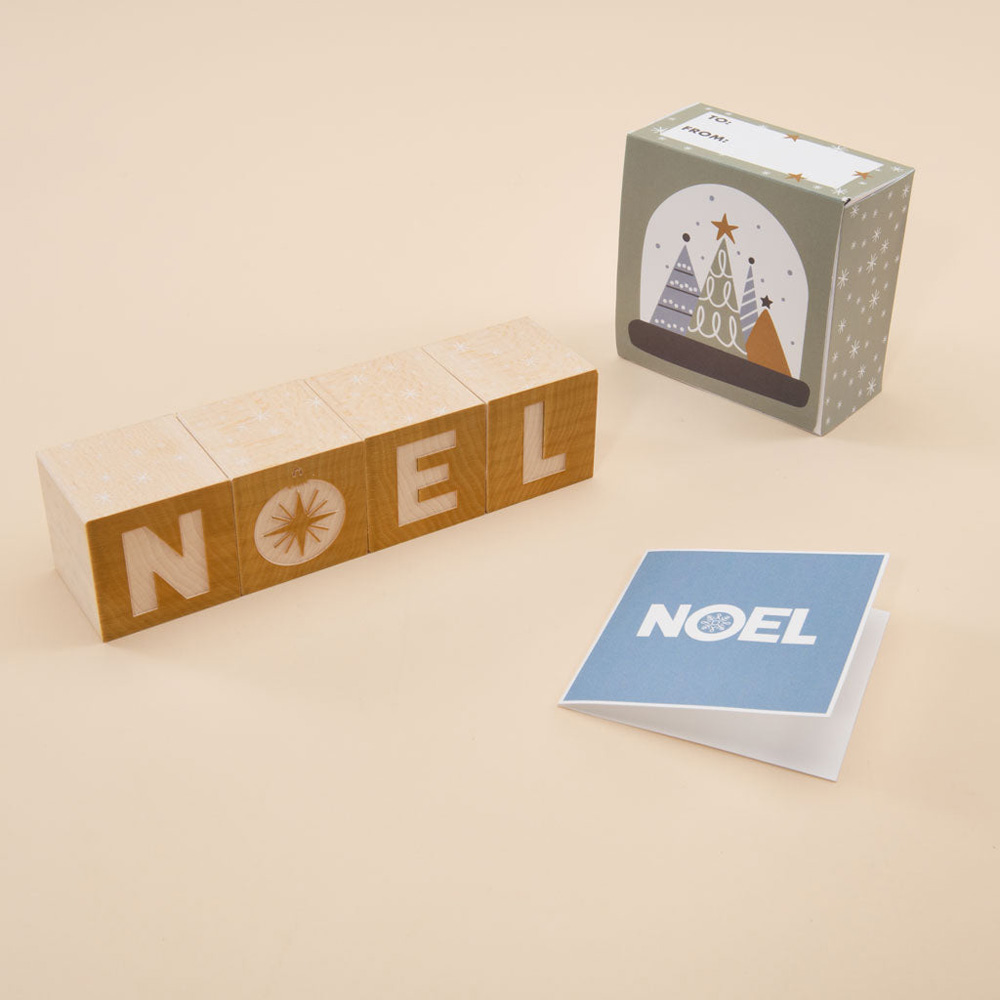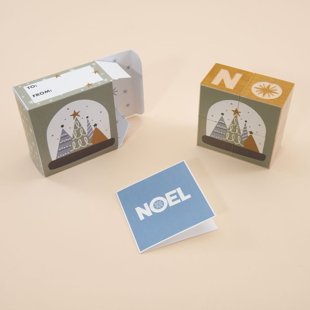 Bring Christmas cheer home for the holidays! Four heirloom-quality wooden blocks spell NOEL. Rearrange the blocks to reveal a magical snow globe scene, filled with Christmas trees. See snowflakes swirl on the remaining sides. This holiday gift doubles as festive decor and an interactive puzzle. A keepsake you’ll treasure year after year. Make spirits bright, block by block. Includes 3.25 x 3.25 in. card for easy gifting