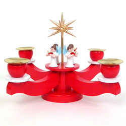 A festive centerpiece for any Christmas table. This version has elegantly curved candlearms and is painted in a beautiful red, with four standing angel choristers surrounding a gilded star. Fits any normal sized candles.