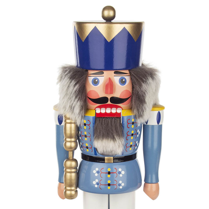 The Wooden Nutcracker King in blue is a striking decorative piece that embodies the traditional craftsmanship of the Erzgebirge region. Standing at 34 cm tall, this nutcracker showcases a regal design with intricate details, making it a perfect addition to your festive decor. Please note that this nutcracker is intended for decorative purposes only.