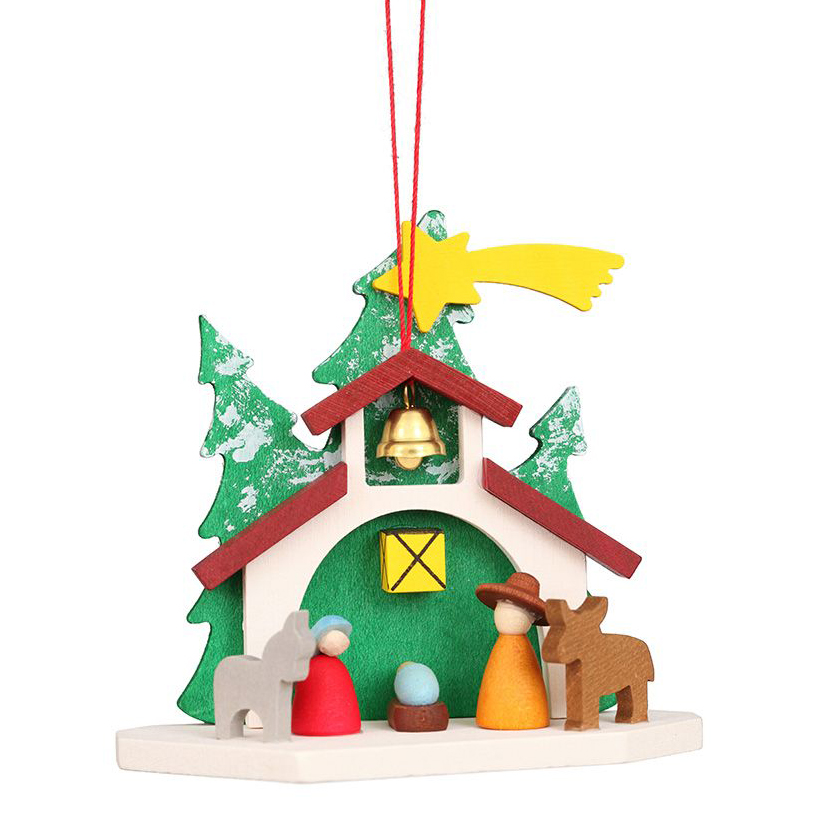 The star of Bethlehem shines brightly above the stable where the Holy Family has gathered. An ox and an ass complete this simple and modern nativity scene hanging ornament. Handcrafted in the Erzgebirge, Germany.