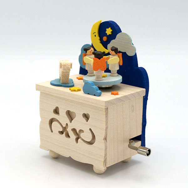 Young angels hold hands in a ring while watching over a sheep in the moonlit. As the crank is turned, the angels spin and the music plays on this beautiful handcrafted music box from Germany's Erzgebirge region. A delightful decoration for your tabletop or mantel, and a wonderful holiday or housewarming gift! Tune: Schlaf, Kindlein, Schlaf (Sleep, Baby, Sleep) or another familiar folk tune.