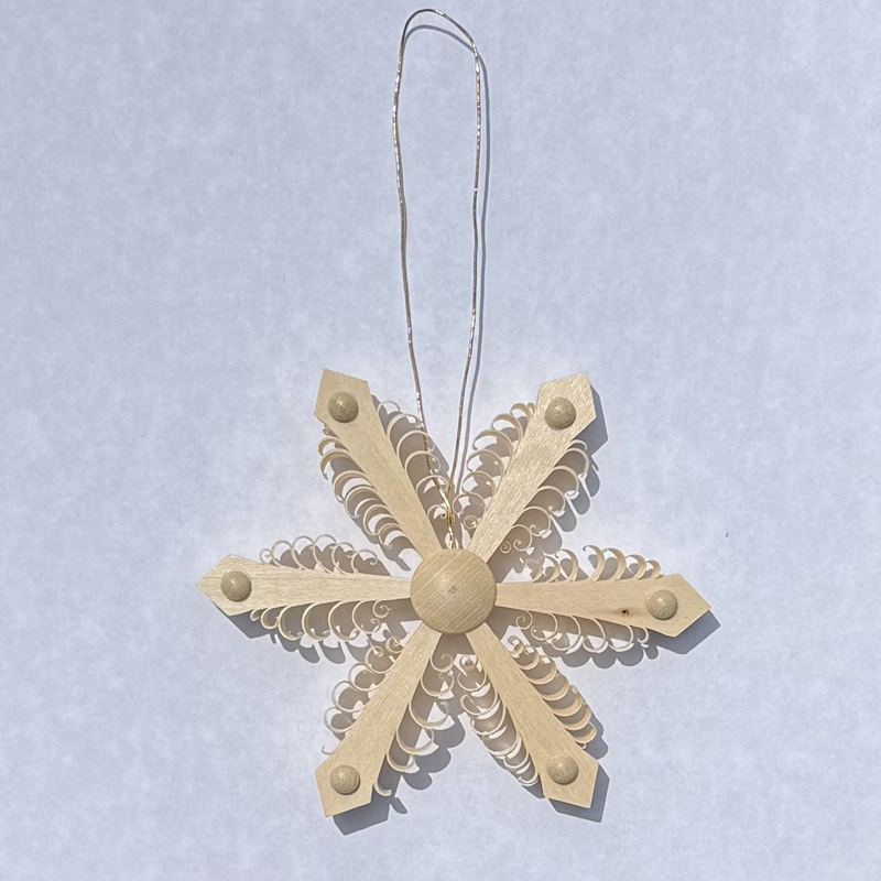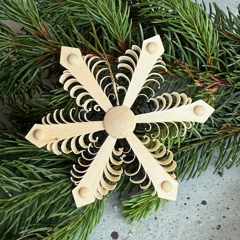 This artistic spanstern with 6 trees combines filigree craftsmanship with traditional design. Six finely engraved by hand chip trees form a harmonious star composition, which is given a special lightness by their fine wooden curls. The natural grain of the linden wood gives the pendant a warm and authentic appearance. Thanks to the stable suspension, this star can be used in many ways - whether as a Christmas tree decoration, elegant window decoration or as a highlight in a Christmas arrangement. The detailed workmanship makes it a real eye-catcher and brings the beauty of the Erzgebirge handicrafts into your home.