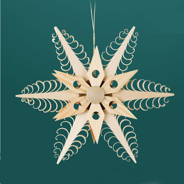 A gorgeous hanging star ornament featuring 6 shaved-wood rays in natural wood with a smaller perforated star in the center. A true piece of Erzgebirge craftsmanship from Germany.