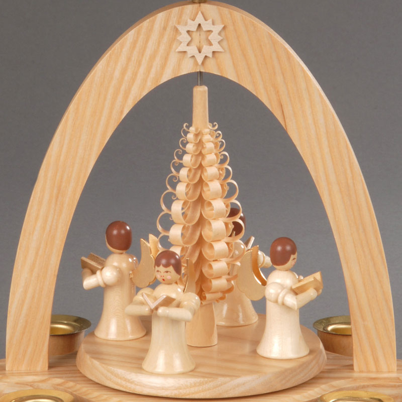 A table pyramid with four candleholders featuring a choir of angels with songbooks. This scene spins around the central spanbaum shaved tree when the candles are lit. Hand-carved and hand-painted, this is a fine example of Erzgebirge craftsmanship.