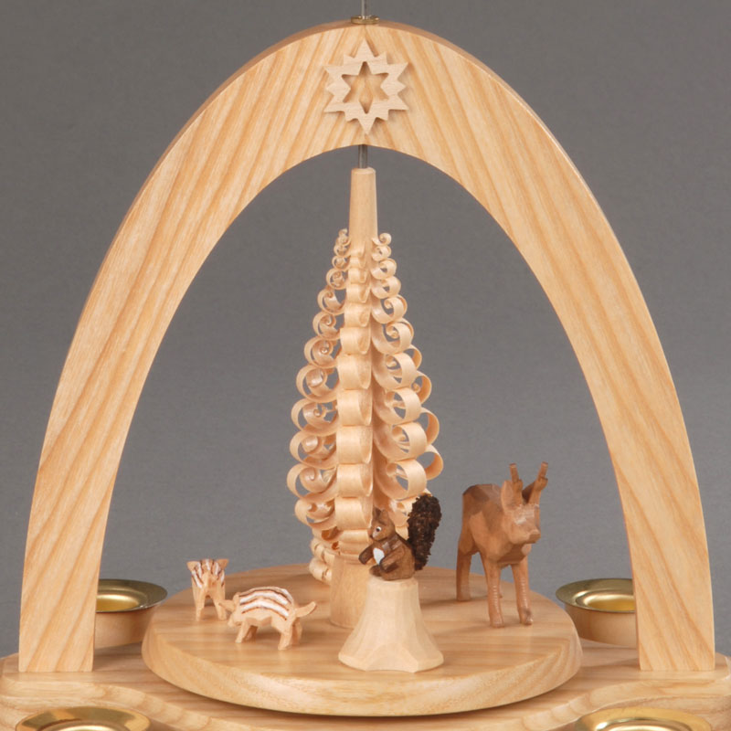 A table pyramid with four candleholders featuring a forest scene including a deer, wild boar piglets and a squirrel on a tree trunk.. This scene spins around the central spanbaum shaved tree when the candles are lit. Hand-carved and hand-painted, this is a fine example of Erzgebirge craftsmanship.