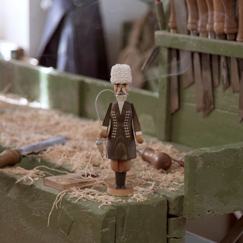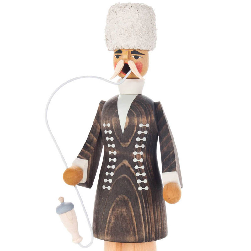 A stately smoking man (Raeuchermann) in traditional Circassian costume. When an incense cone is lit inside the inner chamber, the man puffs his pipe contentedly. A lovely piece of Erzgebirge folk art.