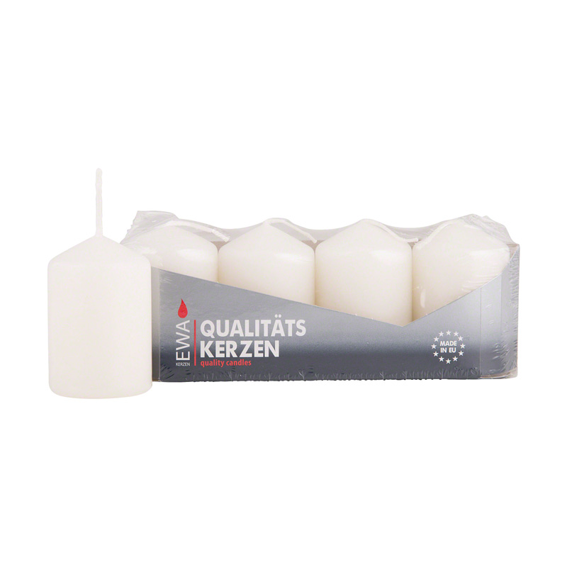 Four pillar candles for an advent candelabra with tealight holders. In a white color. For use with the candelabra of Preissler that take tea lights.