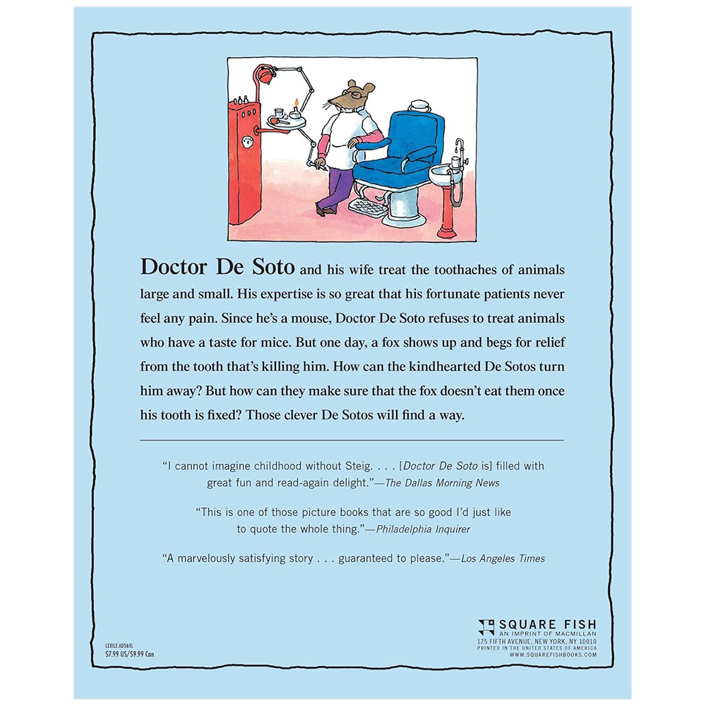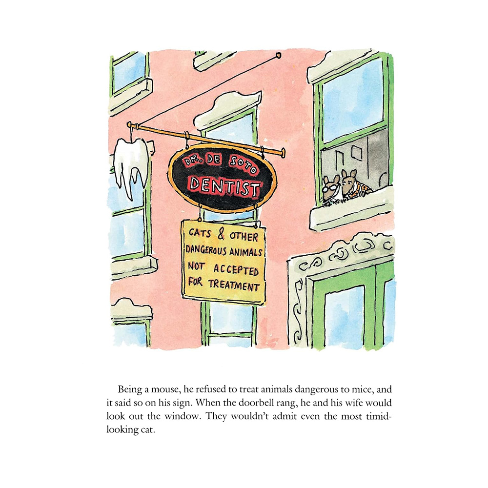 Doctor De Soto, the dentist, did very good work. With the aid of his able assistant, Mrs. De Soto, he copes with the toothaches of animals large and small. His expertise is so great that his fortunate patients never feel any pain. Since he's a mouse, Doctor De Soto refuses to treat dangerous animals--that is, animals who have a taste for mice. But one day a fox shows up and begs for relief from the tooth that's killing him. How can the kindhearted De Sotos turn him away? But how can they make sure that the fox doesn't give in to his baser instincts once his tooth is fixed? Those clever De Sotos will find a way.
