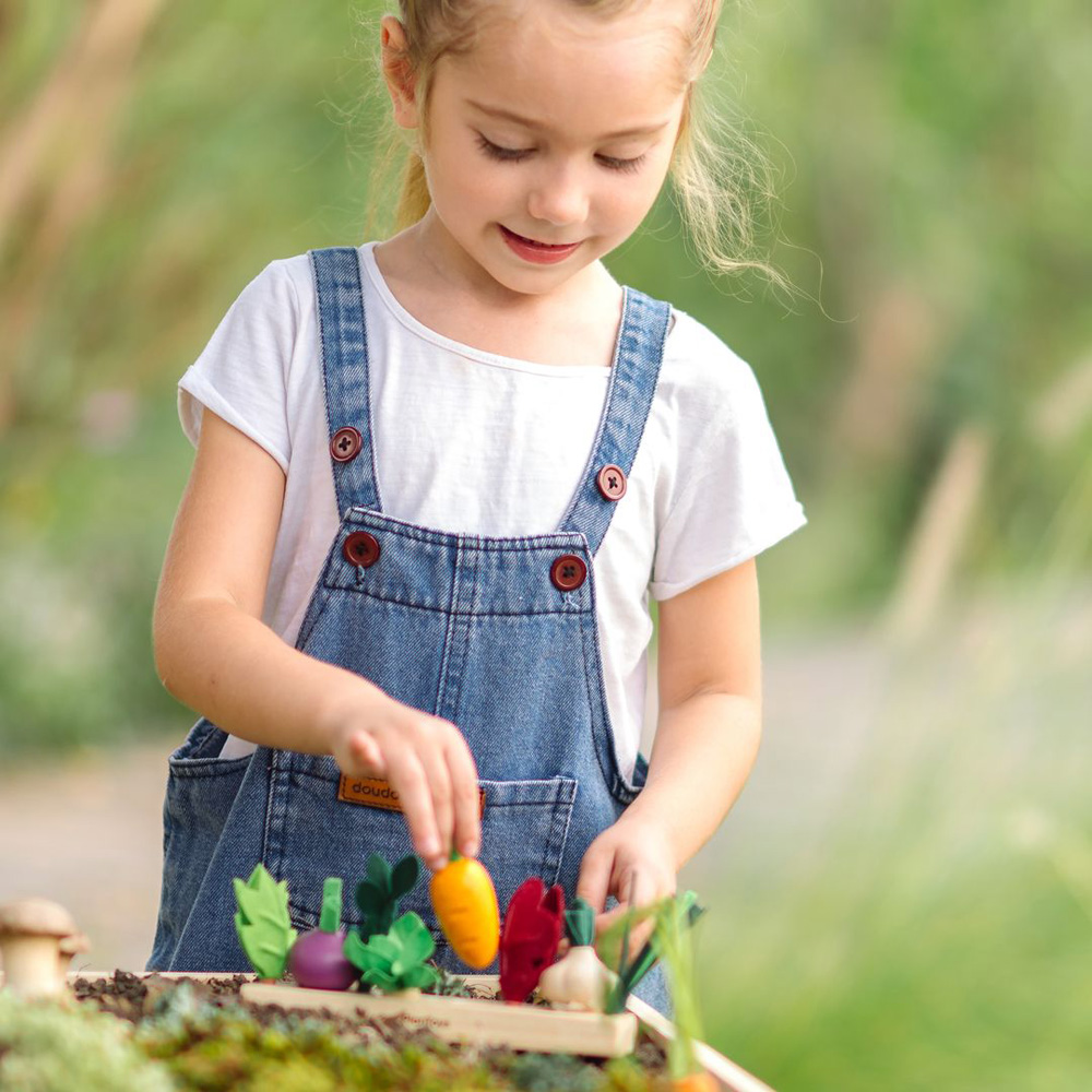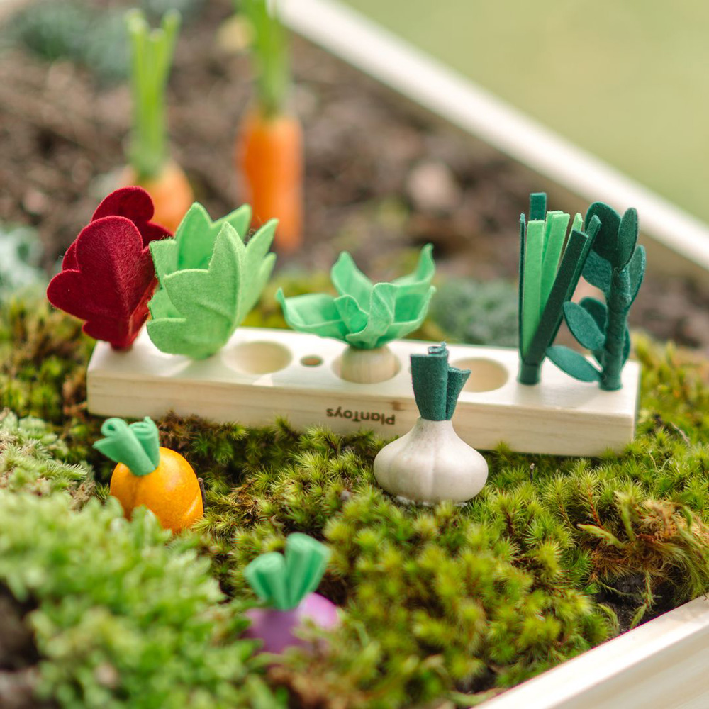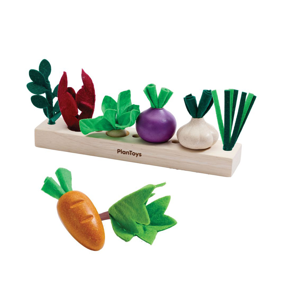 Little hands, big imagination. Children plant and arrange colorful veggies in their own garden bed, learning about nature, color, and care while strengthening fine motor skills, coordination, and creativity through playful discovery. The set includes 7 pieces in total, featuring a wooden garden bed and colorful vegetables. Sustainably made in Thailand using reclaimed rubberwood PlanWood non toxic glue felt fabric organic pigments and water based dyes